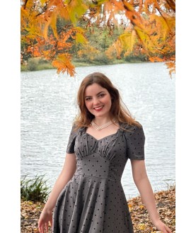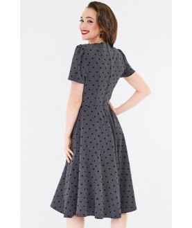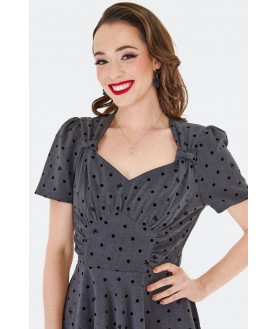 Robe évasée à manches 3/4 style vintage des années 40, de couleur grise, avec un nœud et un motif à pois floqués sur toute la surface. Elle présente un décolleté ouvert, des détails froncés au niveau de la poitrine et du corsage, des poches latérales et une fermeture à glissière dans le dos.