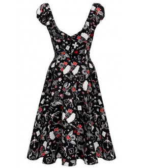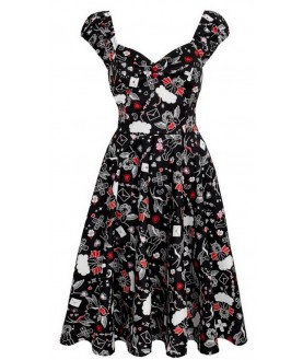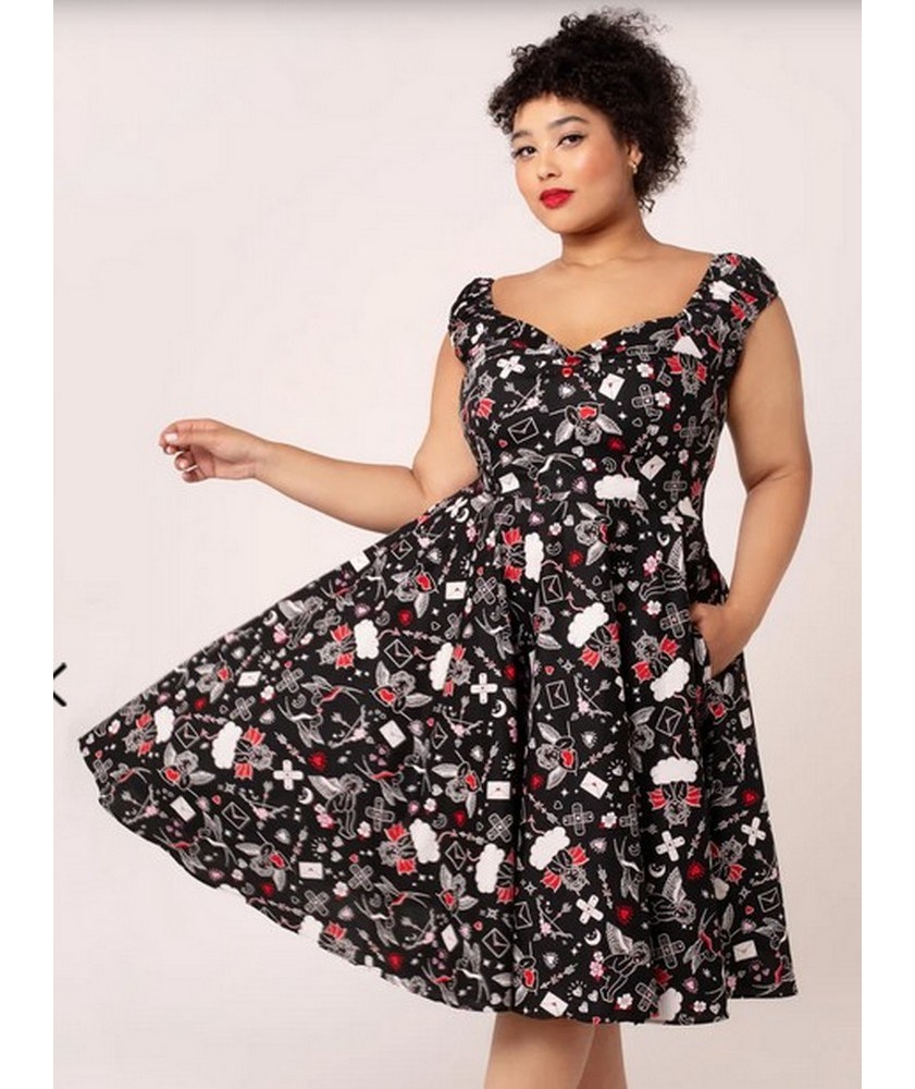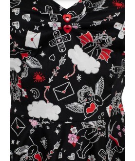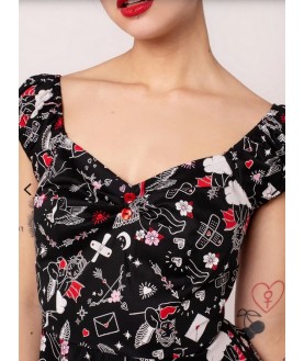 Cette robe en coton imprimé de style années 50 présente une base noire, décorée de motifs de style tatouage représentant des chérubins, des cœurs, des hirondelles et des fleurs.